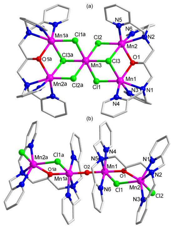 Complex cation 22+ (Figure 1b) consists of two symmetric Mn2 units linked by a μ-O2− atom to form a quasi-linear tetranuclear cluster. The μ-O2− atom locates at the inversion center to give the Mn1-O2-Mn1a angle of 180°. The quite short Mn1–O2 length suggests that Mn1 is typical of valence III [27,28]. The bridging pathways of Mn1-O1-Mn2 (MnIII-O-MnII) and Mn1-Cl1-Mn2 (MnIII-Cl-MnII) are severely asymmetric, where the much shorter Mn1–O1 (1.907(2) Å) bond than that of Mn2–O1 (2.129(2) Å) or the much shorter Mn1–Cl1 (2.4361(9) Å) distance than that of Mn2–Cl1 (2.6821(9) Å) further confirms the valence III characteristic for Mn1, in striking contrast to the character of valence II for Mn2. Mn1 (valence III) or Mn2 (valence II) exhibits distorted octahedral coordination geometry composed of ClN3O2 donors for Mn1 and Cl2N3O donors for Mn2. Owing to the valence III character of Mn1, the Mn1–Namine (2.245(3) Å) and Mn1–Npy (2.127(3)–2.147(3) Å) bonds are much stronger than the corresponding Mn2–Namine (2.433(3) Å) and Mn2–Npy (2.218(3)–2.224(3) Å) bonds. The Mn1···Mn1a distance through the bridging μ-O2− atom is 3.5245(6) Å, which is a little longer than that of Mn1···Mn2 (3.5089(6) Å) across the bridging μ-Cl− atom.
