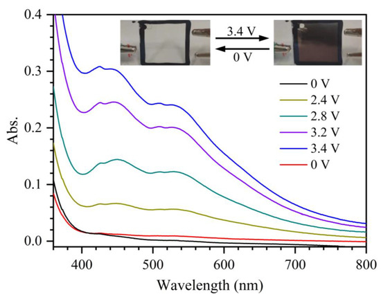 The device was directly placed in the sample holder of a UV–Vis spectrometer and connected to the electrochemical analyzer using a two-electrode configuration. Cyclic voltammetry of devices was conducted at a scan rate of 10 mV/s. The absorption or transmittance spectra of devices under different applied voltages were monitored simultaneously during the electrochemical measurements.