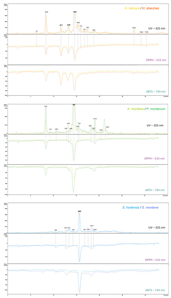 - Li, F.; Zhang, L.-D.; Li, B.-C.; Yang, J.; Yu, H.; Wan, J.-B.; Wang, Y.-T.; Li, P. Screening of Free Radical Scavengers from Erigeron breviscapus Using on-Line HPLC-ABTS/DPPH Based Assay and Mass Spectrometer Detection. Free Radic. Res. 2012, 46, 286–294. [Google Scholar] [CrossRef]