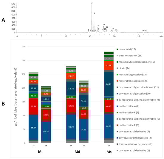 - Kim, J.-S.; Tae-Ha, T.-Y.; Ahn, J.-Y.; Kim, H.-K.; Kim, S. Composition and Quantitative Analysis of Stilbenoids in Mulberry (Morus alba L.) Leaves and Fruits with DAD/UV HPLC. J. Korean Soc. Food Sci. Nutr. 2008, 37, 124–128. [Google Scholar] [CrossRef]