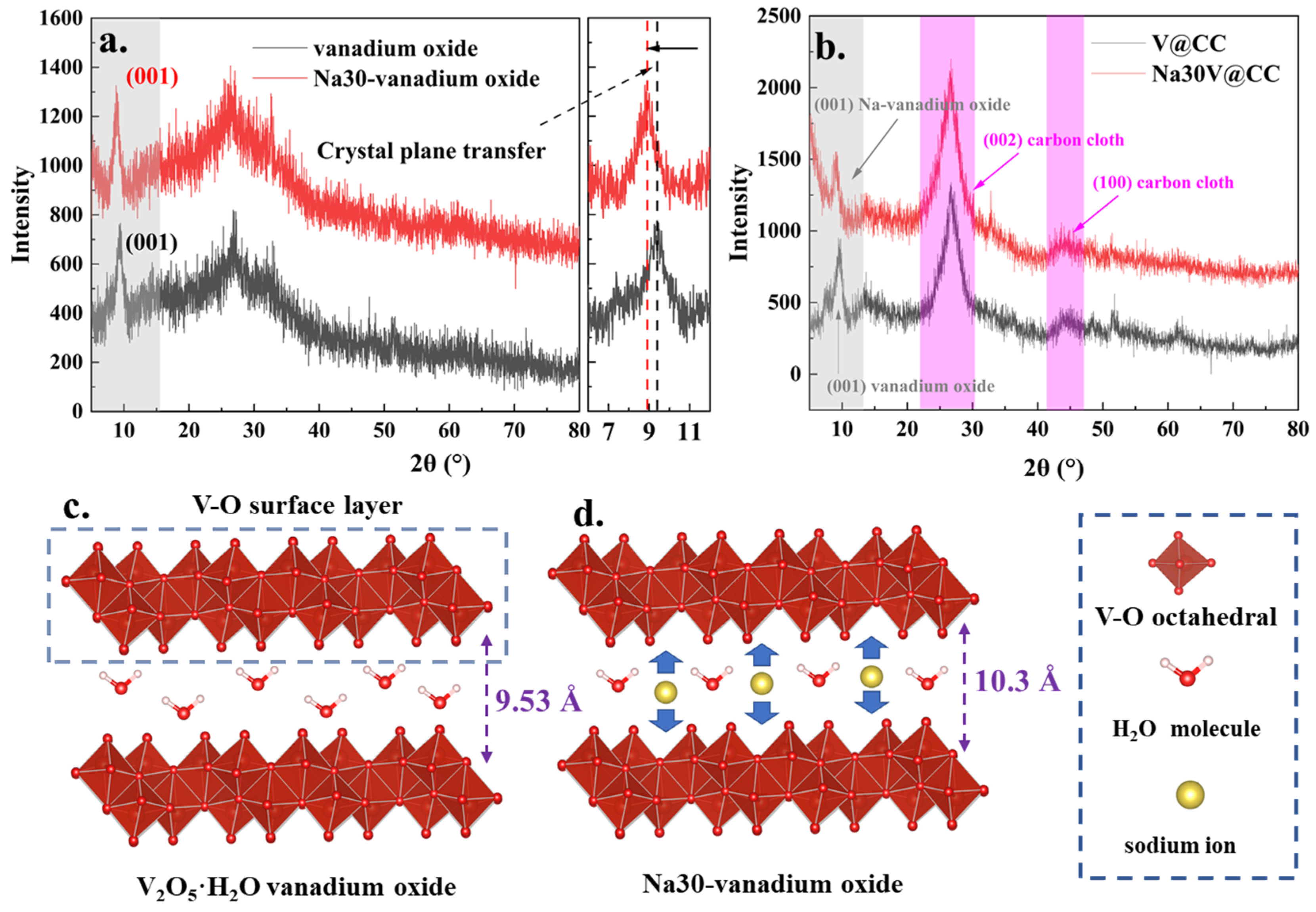 Figure 1 displays the XRD analysis results for vanadium oxide and Na30-vanadium oxide in powder form, as well as for the sheet-like materials V@CC and Na30V@CC. As presented in