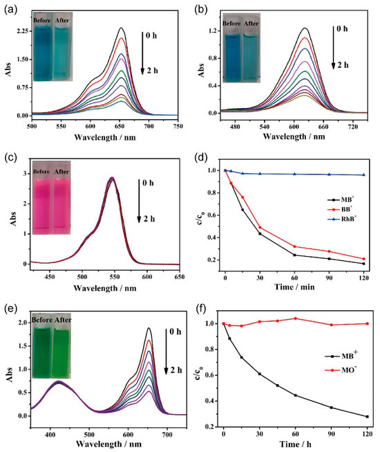 UV-vis adsorption spectra of methanol solution of (a) MB+, (b) BB+ and (c) RhB+ in WR-VMOP-3. (d) The change curve of the concentration of the dyes in the solution with time during the dyes adsorption process. (e) UV-vis adsorption spectra of the selective adsorption of WR-VMOP-3 on mixed dye MB+/MO−. (f) The change curve of the concentration of dyes in the solution with time during the selective adsorption process.
