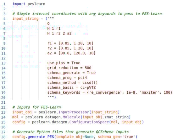 The remaining keywords in the input string describe how to build the QCSchema inputs. Generation of QCSchema inputs is toggled with the ‘schema_generate’ keyword, and ‘schema_prog’ tells QCEngine what EST program to run—Psi4 in the example case. The keywords ‘schema_method’, ‘schema_basis’, and ‘schema_keywords’ define what QCEngine passes on to the EST program stated previously. These keywords should be set according to the EST program being utilized; for example, whatever is passed into ‘schema_keywords’ in the given example must be interpretable by Psi4 as a valid keyword. In the given example, the potential energy surface for water will be generated from CCSD(T)/cc-pVTZ energies. This is a purely illustrative example and, as always, the machine learning model is only as good as the dataset used to generate it. Lines 23–25 allow PES-Learn to interpret the input and utilize it in line 28, which generates the Python scripts to run QCEngine and generate QCSchema inputs and outputs.