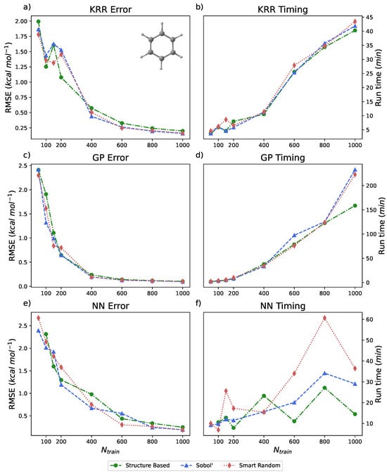 (a,c,e) Root-mean-squared-errors (RMSEs) (in kcal mol−1) for KRR, GP, and NN methods, respectively, available in PES-Learn benchmarked with benzene from the rMD17 database. (b,d,f) Timings (in minutes) for PES-Learn execution when constructing KRR, GP, and NN models, respectively, on benzene from the rMD17 database.