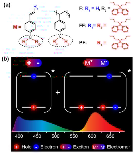 Here, we design and synthesized two luminescent compounds of N,N,-bis(9,9-dibutyl-fluoren-2-yl)-4-vinylaniline (F) and 1-[N,N-Bis(9,9-dibutyl-fluoren-2-yl)]-2-(9,9-dibutylfluoren-2-yl)-ethene (FF) and prepared the homopolymer of F via free radical polymerization [16,17] to obtain the nonconjugated luminescent polymer of poly (N,N,-Bis(9,9-dibutyl-fluoren-2-yl)-4-vinylaniline) (PF) (Figure 1a). We choose free radical polymerization because it is the simplest and most widely used method for vinyl polymerization, although it provides limited control over the polymerization process and is difficult to precisely regulate the molecular weight, distribution, and end-group structure of the resulting polymers [18,19], in comparison to the living polymerization methods capable of precise control over molecular weight distribution with specific end-group functionalities [20,21]. The emission core of these materials is N,N-difluorenevinylaniline, which is highly emissive with triarylamine-based starburst molecular architecture [22] to afford high photoluminescent quantum yields up to 64% in solution and 41% in neat film. The planar structure of fluorenes in N,N-difluorenevinylaniline supports the good aggregation tendency to form electromers at excited states. The nonconjugated backbone of the polymer and the alkyl substituents on fluorenes result in excellent solubility of these materials for solution processing of OLEDs. Indeed, the solution-processed OLEDs were facilely prepared, exhibiting a blue emission band from a single molecular state of the monomer unit and an orange emission band from electromers (Figure 1b) for the single-layer emitting WOLEDs with CIE of (0.30, 0.32), bright white Lmax of 1806 cd/m2, and high CE, PE, and EQE efficiencies up to 4.53 cd/A, 4.18 lm/W, and 2.63%, respectively. These device performance characteristics are among the best ever reported for solution-processed WOLEDs with a single-emitting material.