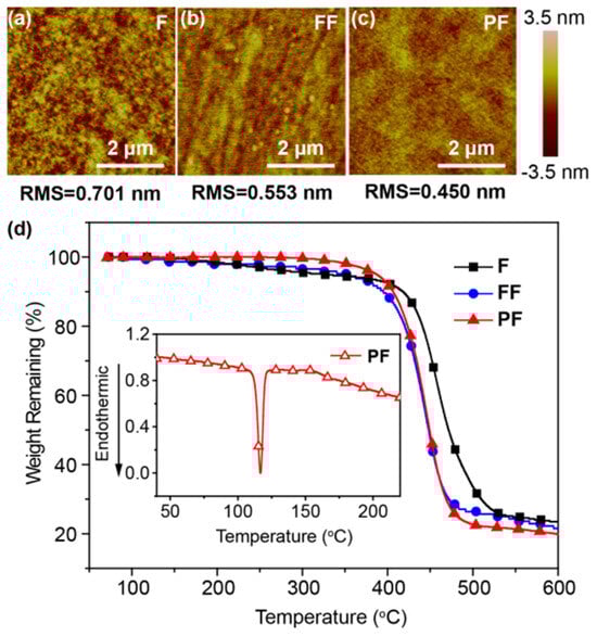 (a–c) AFM height images of spin-coated thin films as well as (d) TGA and DSC (inset) curves of F, FF, and PF.