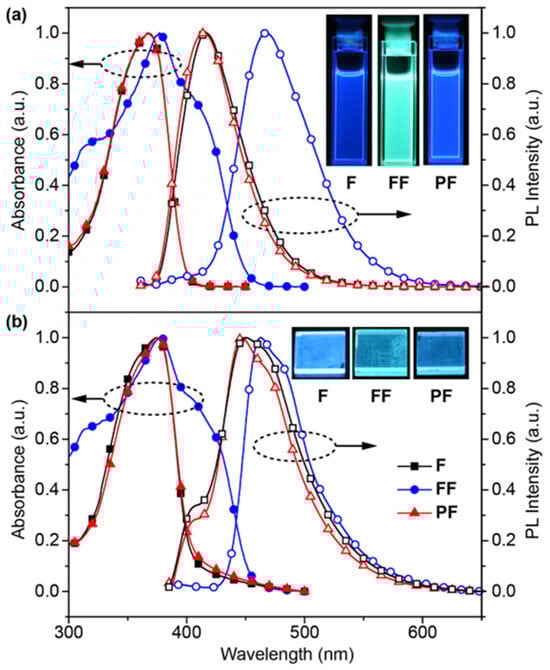 Normalized absorption (abs.) and PL spectra of F, FF, and PF in (a) dilute CH2Cl2 solutions and (b) thin solid films recorded under excitation of 325 and 350 nm UV light, respectively; the insets show the PL photographs taken under 365 nm UV excitation in solution (up) and thin film (down) states.
