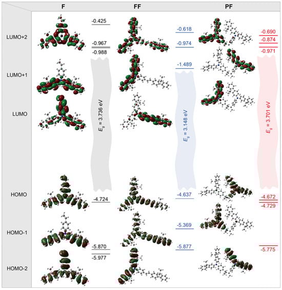 DFT predicted electronic density distributions and energy levels of the frontier molecular orbitals of F, FF, and PF.