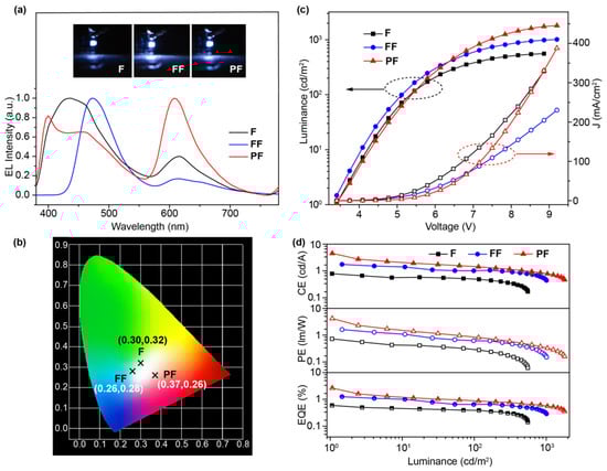 From the current density–voltage–luminance (J–V–L) characteristics and efficiencies versus current density curves of the devices (Figure 5c,d), the turn-on voltages are as low as 3.4 V, which could be attributed to the matched HOMO and LUMO energy level of the spin-coated OLEDs with a low hole and electron injection barrier. Specifically, the F-based OLED exhibits a turn-on voltage of 3.4 V, a maximum CE of 0.79 cd A−1, EQE of 0.60%, and CIE coordinates of (0.30, 0.32) at 14 V. The performances of FF-based device show significant improvements with a low turn-on voltage of 3.4V, CE up to 1.75 cd A−1, EQE of 1.25%, and CIE coordinates of (0.26, 0.28) at 14 V. Impressively, the PF-based device demonstrates the best performance, exhibiting a turn-on voltage of 3.4 V, CE up to 4.53 cd A−1, Lmax of 1806 cd/m2, EQE up to 2.63%, and CIE coordinates of (0.37, 0.26) at 14 V. These performances are among the highest values for the non-doped WOLEDs based on solution-processable EML up to now (Table S5). To further improve the device performance and color stability, the ΦPL of EML material should be increased by advanced material design strategies/preparation methods and the WOLEDs architecture should be sophisticatedly modulated through charge-balance tuning and layer engineering, etc. [34,35].