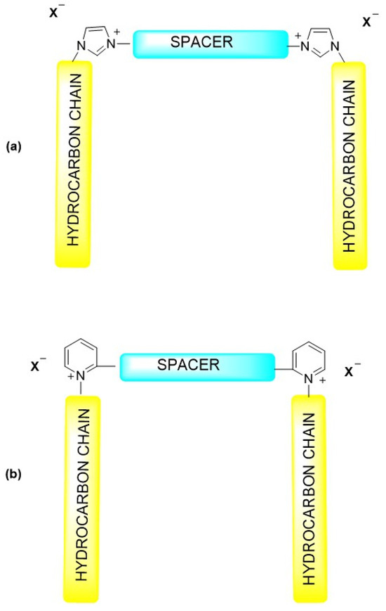 Structural diagram of (a) imidazolium- and (b) pyridinium-based gemini surfactants.