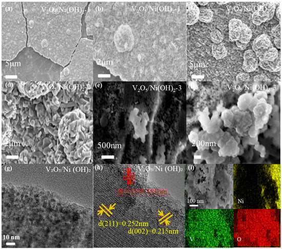 Figure 2 illustrates the surface morphological features of the as-prepared catalysts, as characterized by SEM and TEM. Figure 2a, the SEM image of V2O5/Ni(OH)2-1, reveals that nanoclusters were successfully grown on the nanosheet substrate. However, these nanoclusters are sparsely distributed, indicating fewer available reactive active sites. A magnified view of these clusters is presented in Figure 2b. For the V2O5/Ni(OH)2-2 sample (Figure 2c), it is evident that with an increased V content, the density of cluster structures on the nanosheet surface significantly increases. This enhancement in active sites leads to improved electrochemical performance. The magnified image (Figure 2d) clearly indicates that the clusters are formed by the aggregation of small nanoblocks. These structures are interwoven and stacked, creating an abundance of irregular pores. This nanostructure further constitutes a micron-scale macroporous framework, which greatly facilitates mass transport and electrolyte penetration. Such a hierarchical pore structure and 3D interconnected network offer significant advantages for electrocatalysis. Figure 2e,f displays the morphology of V2O5/Ni(OH)2-3. As the V content is further increased, both the nanosheet and cluster structures diminish. The high-magnification SEM image (Figure 2f) reveals that this irregular structure is formed by the agglomeration of numerous nanospheres, with fine nanoscale particles distributed on the surface, resulting in a significantly smaller overall size. For a detailed structural analysis, high-resolution transmission electron microscopy (HRTEM) images are provided in Figure 2g,h. The V2O5/Ni(OH)2-2 sample, which exhibited the optimal morphology, was selected for HRTEM characterization. The observed lattice fringes of 0.215 nm and 0.252 nm correspond to the (002) and (211) crystal planes of V2O5, respectively. Another distinct lattice spacing of 0.151 nm, observed in the selected area, is in good agreement with the (111) plane of Ni(OH)2. These TEM analysis results are highly consistent with the XRD data, further verifying the successful formation of the V2O5/Ni(OH)2 composite. As shown in Figure 2i, the elemental mapping images of the material indicate that V and O elements are uniformly distributed throughout the central region, whereas Ni is primarily enriched at the edges. This distribution further confirms the successful synthesis of the composite material.
