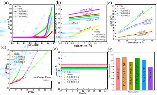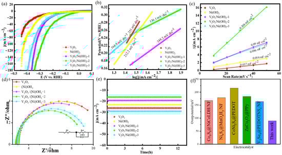The hydrogen evolution performance of electrocatalysts was discussed. A three-electrode system was assembled by using synthetic materials and experimental devices such as an electrolytic cell, carbon sheet, platinum sheet, and silver chloride to study the catalytic performance of HER and OER of several synthetic materials. The scan rate for LSV testing is 5 mV s−1, which balances test efficiency with data accuracy and avoids capacitive current interference. The LSV curves of the five samples are shown in Figure 3a. It can be seen from the figure that the overpotential of the V2O5/Ni(OH)2-2 material is 89.6 mV at a current density of 10 mA cm−2, which is smaller than that of the single V2O5 (251 mV) and Ni(OH)2 (214.8 mV) materials. This also shows that the increase in HER performance is due to the synergistic effect between V2O5 and Ni(OH)2. At the same time, the overpotential of V2O5/Ni(OH)2-2 sample is much smaller than that of V2O5/Ni(OH)2-1 (193.9 mV) and V2O5/Ni(OH)2-3 (168.2 mV). In order to further explore the reaction kinetics of the material, the Tafel slope is calculated by linearly fitting the LSV curve to a polarization curve, as shown in Figure 3b. The Tafel slope of V2O5/Ni(OH)2-2 is 136.1 mV dec−1, which is obviously lower than that of the two pure V2O5 and Ni (OH)2 materials. The Tafel values are 268 mV dec−1 and 212 mV dec−1, respectively. When compared with other materials, V2O5/Ni(OH)2-2 is also significantly lower than V2O5/Ni(OH)2-1 (148.2 mV dec−1) and V2O5/Ni(OH)2-3 (164.9 mV dec−1). Therefore, it can be concluded that a certain proportion of V and Ni elements can enhance the rapid occurrence of the HER reaction process. Compared with the pure sample, it can be concluded that the structure of the composite structure can greatly improve the kinetics of the HER reaction. According to the Volmer–Heyrovsky mechanism, the smaller Tafel value has a faster reaction rate, which is completely consistent with the above experiments, so V2O5/Ni(OH)2-2 is the best sample. In the process of electrochemical reaction, most of the chemical reactions of active substances occur on the surface, and the specific surface area can affect the rate and efficiency of the reaction to a certain extent. Therefore, the larger comparative area can provide more reaction sites and increase the contact area between the reaction substances so as to achieve the effect of improving the reaction. This is the principle of electrochemically active surface area (ECSA). However, there is a direct relationship between ECSA and Cdl, and then ECSA is obtained by measuring Cdl, and finally the kinetics of electrochemical reaction is analyzed. As shown in Figure 3c, the Cdl value of V2O5/Ni(OH)2-2 material is 0.308 mF cm−2, which is much larger than that of the other four materials, and the gap between the materials is significant. The Cdl values of V2O5/Ni(OH)2-1, V2O5/Ni(OH)2-3, V2O5 and Ni(OH)2 are 0.09 mF cm−2, 0.086 mF cm−2, 0.054 mF cm−2 and 0.037 mF cm−2, respectively. It shows that the specific surface area of V2O5/Ni(OH)2-2 material is the largest, the number of active sites is the largest, and the reaction rate is the fastest. It is concluded that the amount of Ni element added will change the morphology of these materials and then change the specific surface area of the composite material, indirectly changing the electrocatalytic performance of the material [30,31]. Through the experiment of electrochemical impedance, the charge transfer performance of the electrode or electrolyte and the kinetics of the reaction process are explored. As shown in Figure 3d, during the HER EIS measurements, V2O5/Ni(OH)2-2 exhibits the smallest semicircle diameter, indicating the lowest Rct of 9.7 Ω and Rs of 2.584 Ω. In contrast, V2O5/Ni(OH)2-1 and V2O5/Ni(OH)2-3 display significantly increased Rct values of 13.1 Ω and 17.3 Ω, respectively, due to insufficient active sites, which substantially hinder reaction kinetics. The stability of the material is another criterion for the speed of the electrochemical reaction to a certain extent. Because good stability represents that the material can maintain excellent reactivity for as long as possible in a certain period of time at −1.12 V, it can be found from Figure 3e that the overpotential of these materials does not change after 24 h at current densities of 26, 24, 20, 16 and 28 mA cm−2 (at −0.24, −0.25, −0.14, −0.17, and −0.23 V). This indicates that the synthesized materials V2O5/Ni(OH)2-1, V2O5/Ni(OH)2-2, V2O5/Ni(OH)2-3, V2O5 and Ni(OH)2 can remain stable in the HER reaction. Electrocatalytic performance of V2O5/Ni(OH)2-2 nanowires is comparable with other reported catalysts, as presented in Figure 3f. The as-prepared catalysts possess more excellent performance than others [29,32,33,34,35].