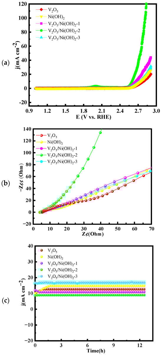 The long-term stability of the catalysts during overall water splitting is illustrated in 1.6 V (Figure 5c). After 12 h of continuous electrolysis, V2O5/Ni(OH)2-2 maintains excellent stability with negligible fluctuation in current density. In contrast, Ni(OH)2 and V2O5/Ni(OH)2-3 exhibit noticeable current variations, underscoring the outstanding durability and overall electrocatalytic performance of V2O5/Ni(OH)2-2 for practical applications.