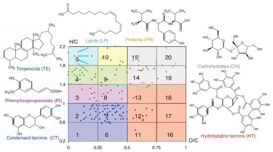 Mapping such Van Kevelen diagrams (Figure 2) allows classifying the main components of HS into classes of organic compounds [6].