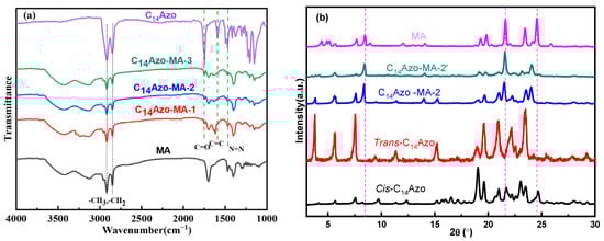 (a) FT-IR spectra and (b) XRD of C14Azo and C14Azo-MA.