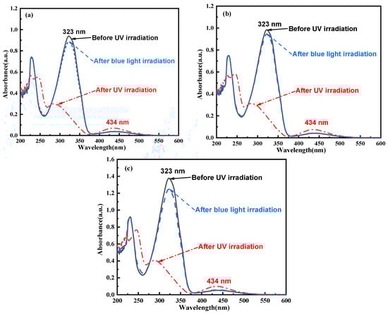UV–Vis absorption spectra of (a) C14Azo-MA-1 (b) C14Azo-MA-2 and (c) C14Azo-MA-3 in DCM at room temperature before and after UV irradiation (365 nm, 20 mW cm−2) and blue irradiation (450 nm, 60 mW cm−2).