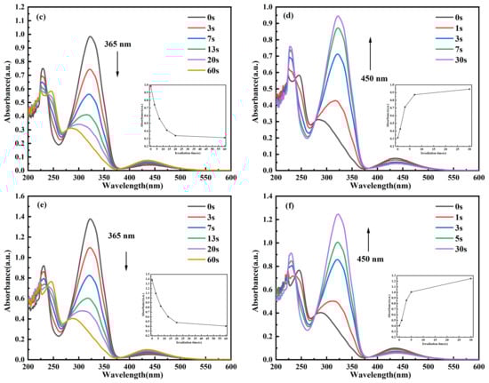 Time-dependent UV–Vis absorption spectra of C14Azo-MA in DCM at room temperature. (a) C14Azo-MA-1 (c) C14Azo-MA-2 and (e) C14Azo-MA-3 irradiated by 365 nm UV light with the evolution of Abs vs. time at 323 nm shown in the inset. (b) C14Azo-MA-1 (d) C14Azo-MA-2 (f) C14Azo-MA-3 irradiated by 450 nm blue light with the evolution of Abs vs. time at 323 nm shown in the inset.