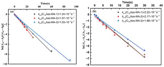 Based on the aforementioned findings that C14Azo-MA possesses a high degree of isomerization and good photoreversibility, the kinetics of the photoinduced trans-to-cis and cis-to-trans isomerization processes for C14Azo-MA in DCM solution were quantitatively studied under 365 nm and 450 nm light irradiation. The first-order rate constants for isomerization were calculated using Equation (1) [42].