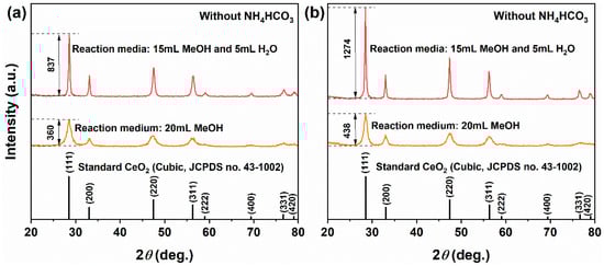 Figure 1a presents the XRD patterns of precursors obtained through solvothermal processes in 20 mL pure MeOH and in a mixed solvent comprising 15 mL MeOH combined with 5 mL H2O. In the pure MeOH system, the precursor displayed four distinct diffraction peaks at 28.57°, 32.11°, 47.30° and 56.25°, which correspond to the (111), (200), (220) and (311) crystal planes of cubic fluorite-structured CeO2 (JCPDS No. 43-1002). The diffraction intensity observed for the (111) plane was measured at 360. Although other peaks were relatively weak, they remained identifiable and aligned closely with standard patterns for CeO2; thus confirming that the product consisted predominantly of single-phase CeO2, albeit featuring relatively low crystallinity. In contrast, when prepared within the MeOH–H2O mixed solvent system, the precursor exhibited eight clear diffraction peaks that fully matched those outlined in standard cubic CeO2 patterns corresponding to crystal planes (111), (200), (220), (311), (222), (400), (331), and (420). No impurity phases were detected under these conditions. Notably, there was an increase in diffraction intensity for the (111) plane up to 837, a significant enhancement of approximately 132.5%, which suggests improved crystallinity attributed to the facilitating role of H2O in promoting Ostwald ripening processes along with better crystal development.