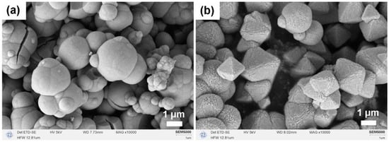 Figure 3 illustrates the micro-morphologies of CeO2 produced after calcination in two different solvent systems. In the pure MeOH system (Figure 3a), CeO2 particles exhibited spherical hard aggregates due to incomplete Ostwald ripening. Conversely, in the MeOH–H2O mixed solvent system (Figure 3b), the addition of H2O effectively inhibited hard aggregation, enhanced particle monodispersity, and facilitated the formation of regular micron-sized octahedral structures with edge lengths less than 3 μm. This observation suggests that H2O plays a crucial role in mediating chemical reactions between Ce3+ ions and MeOH, guiding the transformation of agglomerates into a thermodynamically more stable octahedral morphology.