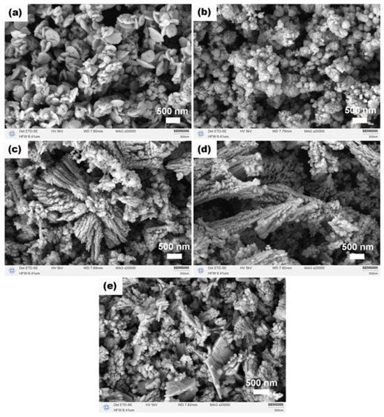 SEM images of CeO2 samples synthesized solvothermally at 180 °C for 12 h with different Ce:N molar ratios of (a) 1:3, (b) 1:4, (c) 1:5, (d) 1:6, and (e) 1:7 after calcination in air at 500 °C for 1 h.
