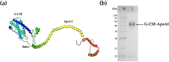 Recombinant chimeric protein G-CSF-ApoA-I. (a) Tertiary structure of G-CSF-ApoA-I; (b) SDS-PAGE analysis of purified recombinant chimeric G-CSF-ApoA-I. Lane M—standard protein molecular weight marker (Sib Enzyme) (10–200 kDa); 1—purified recombinant G-CSF-ApoAI.