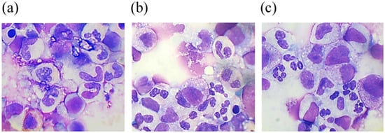 Bone marrow smears were prepared and stained with May–Grunwald and Giemsa dyes. Stained cells were assessed microscopically (Axio Scope A1 fluorescence microscope (Zeiss), Jena, Germany), and 500 BMCs per smear were counted.