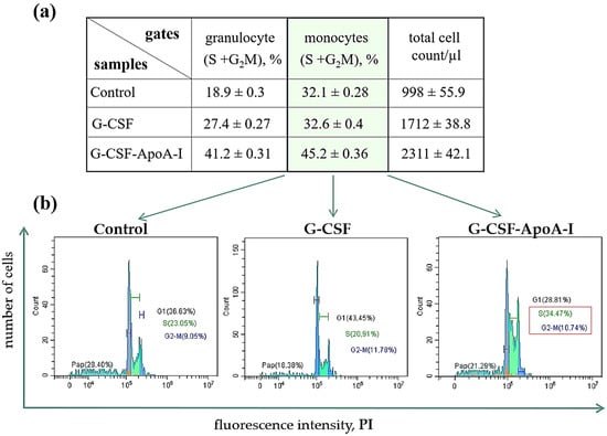Growth factors support the viability and proliferation of cells sensitive to their action. The study of the cell cycle allows an assessment to be made of the deposit of the factor to the proliferation of targeted cells. We conducted a study of the cell cycle of human bone marrow cells under the influence of G-CSF and G-CSF-ApoAI. Data on the cell cycle of all cells, as well as on the cell cycle of the granulocyte and monocyte gates, are presented in (Supplementary Materials Figure S1 II,III).