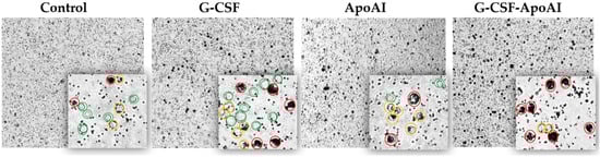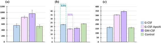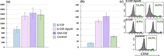 As Figure 5 shows, the incubation of human MNCs with G-CSF for 24 h did not significantly increase the total cell count or the number of CD14-expressing cells compared to the control (518 ± 56.76 cell/μL for control and 555.75 ± 67.57 cell/μL for G-CSF; for CD14+, 161.35 ± 6.85 cell/μL and 165 ± 9.43 cell/μL, respectively). Recombinant, GM-CSF and G-CSF-ApoAI equally increased both the total cell count and the number of CD14+ monocytes in the MNC culture (836.25 ± 42.5 cell/μL—G-CSF-ApoAI and 959.5 ± 121.1 cell/μL—GM-CSF), with CD14+ expression of 306.25 ± 4.64 and 345.27 ± 8.98 cell/μL, respectively, after 24 h of incubation (Figure 5a,c).