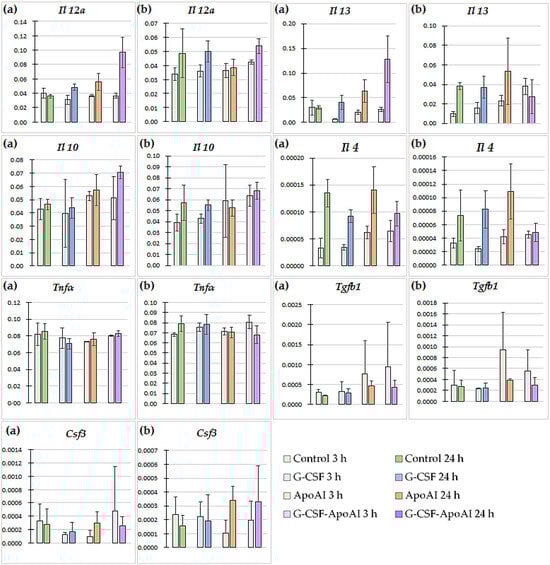Time-dependent changes in cytokine gene expression were also observed within each experimental group with and without particles. The greatest difference in cytokine gene expression among the groups with the studied proteins was observed in the G-CSF-ApoAI group. Thus, IL-12 expression levels in the G-CSF-ApoAI group without particles were 0.036 ± 0.0034 at 3 h, and 2.7 times higher (0.097 ± 0.0021) after 24 h (Figure 8a). The introduction of particles caused a slight increase in Il 12 expression at 3 h (0.042 ± 0.00542) compared to the group without latex particles, with a further insignificant increase to 0.0536 ± 0.00159 at 24 h of incubation (Figure 8). Thus, at 24 h of incubation, the expression level of the gene encoding IL-12 α was significantly lower in the group with particles compared to the group without particles in the presence of the chimeric protein (Supplementary Materials Figure S2). The most pronounced time-dependent changes were observed when studying the dynamics of Il 13 gene expression. In the group without particles, its increase at 24 h in the G-CSF, ApoA-I, and G-CSF-ApoAI groups was 4-, 3-, and 5-fold, respectively (Figure 8). With the introduction of particles, the mRNA level of the gene encoding IL-13 increased over time by 4-fold in the control group and by 2.4–2.3-fold in the G-CSF and ApoA-I groups, respectively. At the same time, in the G-CSF-ApoAI group, there was a 1.4-fold decrease in Il 13 gene expression by 24 h of incubation (0.0275 ± 0.00172) compared to at 3 h (0.038 ± 0.0084) (Figure 8, Supplementary Materials Figure S2).