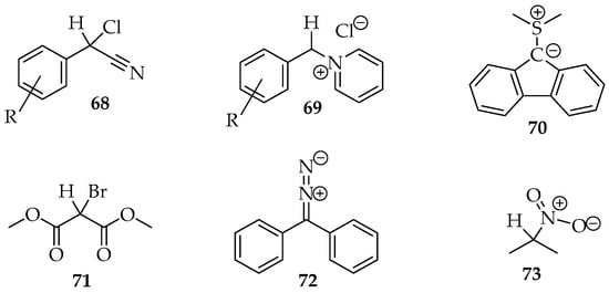 Many examples of this reaction type were reviewed by Hamer and Macaluso [4]. The construction of species 65 usually consists of aryl, cyano or carbonyl substituents in positions R2 and R3 (Scheme 19). Hence, the hydron or another electrophile is eliminated more easily from the molecule, for example, by adding a base. Several compounds with halogens, diazo, or nitro groups (Figure 4) have been reported for the nucleophile. The nitro compounds with α-hydrogens 73 are excellent; the nitro substituent facilitates hydron removal through structure stabilization by resonance and acting as the nucleophile leaving group [3]. Additionally, pyridinium salts 69 and sulfur ylides 70 (Figure 4) are also very good nucleophiles [3,4].