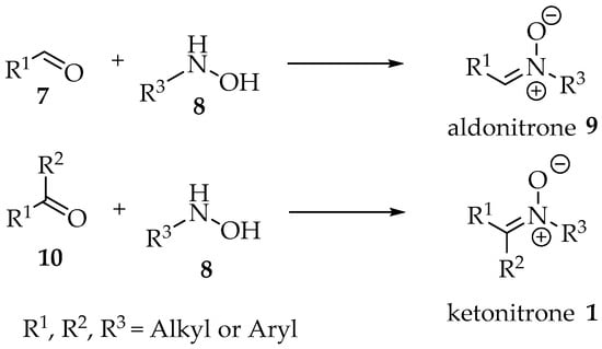 Finally, one distinction often made is between aldonitrones and ketonitrones (Scheme 1) [4]. In the first case, only one substituent is present in the sp2 carbon, whereas in the second case the nitrone is fully substituted. These designations should result from the reaction between hydroxylamine derivatives and aldehydes or ketones, respectively (Scheme 1).
