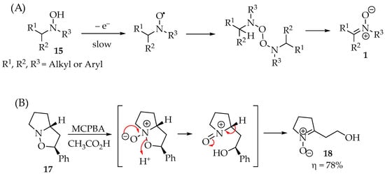 To better elucidate the redox chemistry phenomena in these reactions, Scheme 3A shows the process’s main steps. Although they are not exclusive, as the reactions depend on the oxidant reagents used, they are the most ubiquitous for hydroxylamine derivatives 15. In the case of the hydroxylamine derivatives 15, they lose the N-hydroxyl hydrogen, forming the nitroxide radical. The simplicity of this step determines the hydroxylamines’ anti-oxidative properties in their applications. Then, depending on the substituents’ hindrance, they may either form a dimer or proceed readily to their disproportionation. As a result, the nitrone product 1 is obtained from each of the two nitroxide radicals, and the hydroxylamine reagent 15 can be recovered (Scheme 3A) [20]. An illustrative example is the oxidation of isoxazolidine 17 (Scheme 3B) [21,22], whereas the isoxazolidine’s behavior is similar to that of hydroxylamine.
