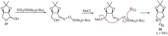 A particular system in which nitrones are obtained in good yields is the case of activated hydroxyl substituents (as leaving groups from the electrophile) (Scheme 10). This has been achieved by mesylating aldose oximes with methanesulfonyl chloride (MsCl) in pyridine [38]. An alternative is using Mitsunobu conditions: adding triphenylphosphine and diisopropyl azodicarboxylate reagents to the alcohol, to activate the hydroxyl group [35].