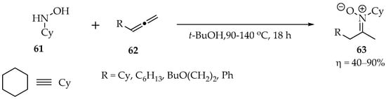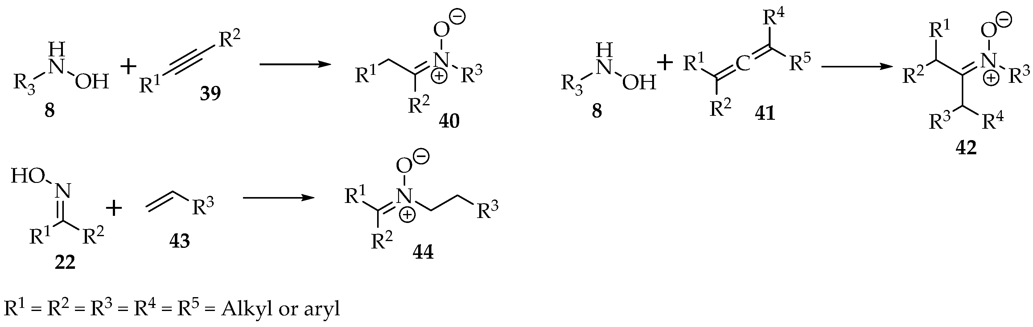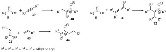 Besides substitutions, the nucleophilic hydroxylamines 8 and oximes 22 can be added to alkynes 39, allenes 41, or alkenes 43 to produce nitrone derivatives (Scheme 11).