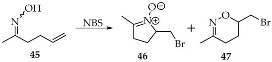 The first reaction using oximes addition to alkenes became famous with the studies of Grigg, hence receiving his name [3,41]. However, in Grigg’s synthesis, many side reactions may occur, like in the nucleophilic substitutions. The ambidexterity of oximes results in nitrones and oxime O-ethers, depending on the reaction conditions and the nature of the reagents. Furthermore, both the obtained nitrone derivatives can react with alkenes through 1,3-dipolar cycloadditions, producing heterocyclic compounds. Many examples showing this reactivity of nitrones can be found in the literature [42]. The examples provided by Grigg’s synthesis show that it is difficult to obtain the isolated nitrone. For instance, oxime 45 undergoes an intramolecular cyclisation to produce nitrone 46 in low yield and oxazine 47 in good yield (61%) (Scheme 12) [43].