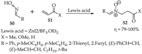 Finding suitable Lewis’s acids for this reaction can be arduous. In another study, in which several aldoximes were reacted with α,β-unsaturated carbonyl compounds, the best combination of Lewis acids was the proportion of 1:1 ZnI2/BF3•OEt2 (Scheme 14) [45]. When only zinc iodide was tried, a mixture with the oxime O-ether was formed, whereas the reaction was not completed with only the second component. According to Roca-López et al. [36], the nitrone is formed when there is an orthogonal disposition of the oxime with the alkene moiety.