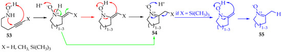 Depending on the reagents used, the addition mechanism can be either a nucleophilic attack or radical formation. The second case is rarer, however, successfully achieved for the first time by Han et al. [47]. The radical initiator was diethyl diazenedicarboxylate, and 5-exo-trig selectivity was evident. Additions through both nitrogen and oxygen are possible, with the product favored by the previous selectivity. For the intramolecular reaction of hydroxylamine derivatives with alkynes, cyclic nitrones 53 are produced, and their ring members are between five and seven (Scheme 15). In the case where the hydroxylamine derivatives with alkynes are silylated, that is, X = Si(CH3)3, the substituent is lost and nitrones 55 (Scheme 15) [48] are obtained. Between the three substituents presented in Scheme 15, the methyl group has the worst results for not polarizing the triple bond. Therefore, a slower reaction and worse yields are expected. This feature is generally common in Cope eliminations [49].