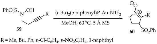 In a new gold catalysis reaction, the intramolecular cyclization of the hydroxylamine 59 with its alkyne moiety, with a concomitant transfer of a sulfonyl group from N- to α-position, has been achieved (Scheme 17). In addition to the Au catalyst, methanol at 60 °C and molecular sieves were used. The resulting nitrone 60 was obtained with yield ranging between 39% and 88% [52].