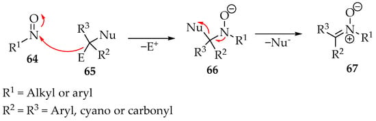 The nitroso compound 64 is in a high-oxidation state, so acting primarily as an electrophile is natural. As a result, a hydroxylamine’s conjugated base forms 66 as an intermediate. Then, the nucleophile is expelled from the molecule by the nitrogen’s electron pair (Scheme 19). This theory has already been supported in forming imines when the nucleophile group is absent by eliminating a water molecule from the intermediate 66 [3,54]. Nevertheless, more conclusive studies are required.