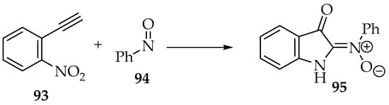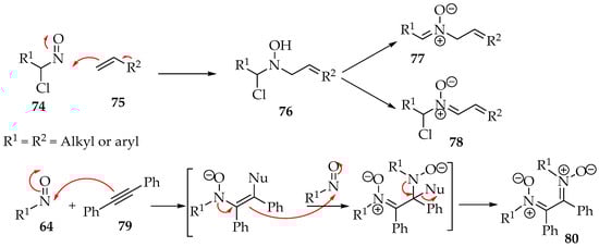 The nitroso reagents can also react with multiple bonds, which has led to the discovery of new nitrone syntheses in the last two decades. Instead of having an electrophile in the structure, the π bond provides the electrons to the nitroso group. Then, there is either a nucleophile, as in compound 75, or another π bond, as in alkyne 71, to set up the final nitrone (Scheme 20).