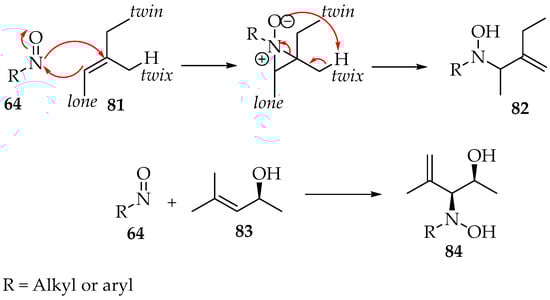 The preparation of a compound like 77 requires, for example, a geminal chloronitroso reagent, which has been synthesized by Bou-Moreno et al. [55] from secondary nitro substituents and oxalyl chloride. Then, Adam and Krebs explored how it reacts with the alkene [56]. First, an aziridine N-oxide is believed to be formed as an intermediate (Scheme 21). Then, in the transformation to the hydroxylamine derivative 82, the hydron captured by its oxygen belongs to the twix position (Scheme 21). Moreover, in the case of the formation of chiral derivatives, the carbon-nitrogen bond formation can be directed by adjacent hydroxyl groups to the threo-stereochemistry, as exemplified by compound 84 (Scheme 21) [56].