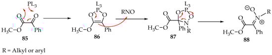 One more excellent reaction is the formation of nitrones from 1,2-dicarbonyl compounds in the presence of N,N,N′,N′,N″,N″-hexamethylphosphanetriamine [P(NMe2)3 = PL3]. The phosphine derivative transforms the 1,2-dicarbonyl 85 into a dioxaphosphole derivative 86, which then reacts with the nitroso compound (Scheme 22) [57]. The mechanism has still not been verified experimentally. Still, the most accepted possibility is the formation of dioxazaphospholidine derivative 87, which, upon ring opening and elimination of the phosphine moiety, gives the desired nitrone 88 (Scheme 22) [57].