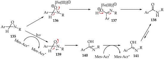 - Park, J.; Park, S.; Jang, G.S.; Kim, R.H.; Jung, J.; Woo, S.K. Weak base-promoted selective rearrangement of oxaziridines to amides via visible-light photoredox catalysis. Chem. Commun. 2021, 57, 9995–9998. [Google Scholar] [CrossRef]