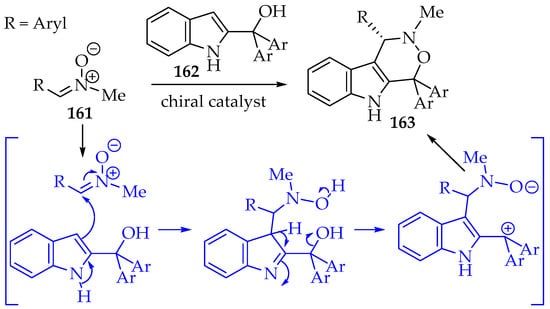 - Li, T.-Z.; Liu, S.-J.; Sun, Y.-W.; Deng, S.; Tan, W.; Jiao, Y.; Zhang, Y.-C.; Shi, F. Regio- and enantioselective [3+3]-cycloaddition of nitrones with 2-indolylmethanols enabled by cooperative organocatalysis. Angew. Chem. Int. Ed. 2021, 60, 2355–2363. [Google Scholar] [CrossRef]