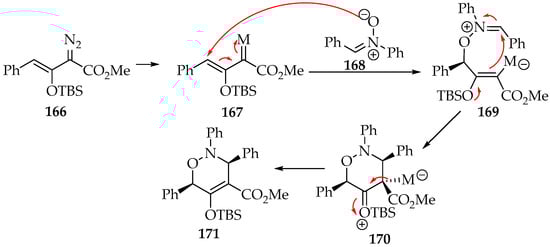 - Wang, X.; Xu, X.; Zavalij, P.Y.; Doyle, M.P. Asymmetric formal [3 + 3]-cycloaddition reactions of nitrones with electrophilic vinylcarbene intermediates. J. Am. Chem. Soc. 2011, 133, 16402–16405. [Google Scholar] [CrossRef]