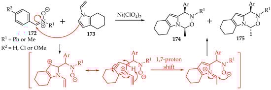 Mechanistically, this synthesis is concerted in the first step, with no radicals being formed (Scheme 15) [48,49,50]. Then, the hydron is transferred from nitrogen to oxygen in a bimolecular process, requiring another molecule with labile hydrons, which can be obtained from the solvent (Scheme 15—red step). Beauchemin et al. [50] have calculated the energy involved, and found this to be more favorable than direct intramolecular hydron transfer between the two atoms. Finally, the last step towards forming the nitrone 54 is similar to the first step, with a concerted mechanism. Fox et al. [48] proposed that the hydron is transferred directly from nitrogen to the α carbon, due to tautomerization (Scheme 15—green step). Regardless of the mechanism, the reaction was tried successfully between a hydroxylamine derivative and an alkyne from two distinct molecules. The solvent used was propanol, at 110 °C for 14 h. The yield was good (52%) [50]. Excellent yields were obtained in another study for intramolecular reactions, using 5 mol% AgOTf in 1,2-dichloroethane, at room temperature, to a maximum of 4 h [51].