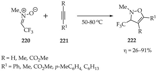 - Tanaka, K.; Ohsuga, M.; Sugimoto, Y.; Okafuji, Y.; Mitsuhashi, K. Applications of the fluorinated 1,3-dipolar compounds as the building blocks of the heterocycles with fluorine groups. Part XII. Synthesis of trifluoromethylisoxazolines and their rearrangement into trifluoromethylaziridines. J. Fluorine Chem. 1988, 39, 39–45. [Google Scholar] [CrossRef]