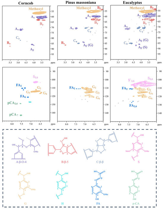 In the side chain regions of the three types of lignins, cross-signals of methoxy groups and representative inter-unit bonds are observed. These bonds include β-O-4 (A), β-β (B), and β-5 (C). They are quantitatively analyzed through regional integration (Table 1). Comparative analysis of inter-unit bonds shows that the β-O-4 bond content in CL is the highest. In contrast, the β-O-4 bond content in eucalyptus lignin is the lowest. Notably, CL has the lowest methoxy content due to the higher content of G and H units. Conversely, EL contains a large amount of S units, resulting in the highest methoxy content.