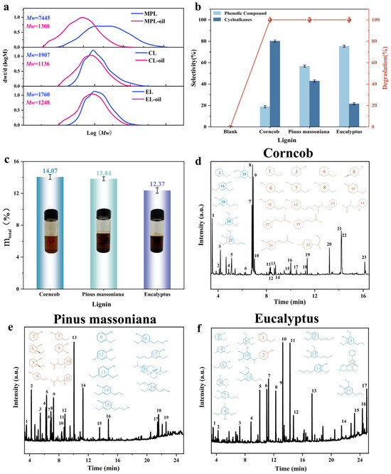Depolymerization of various lignins: (a) molecular weight distributions, (b) conversion rate, and (c) total product yield. GCMS of bio-oil: (d–f).